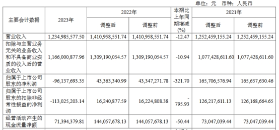 2023年,公司实现营业收入12.35亿元,同比下降12.47%;归母净利润为-9613.77万元,上年同期为4336.33万元;扣非净利润为-1.13亿元,上年同期盈利1624.09万元;经营活动产生的现金流量净额为7139.44万元,同比下降50.44%。