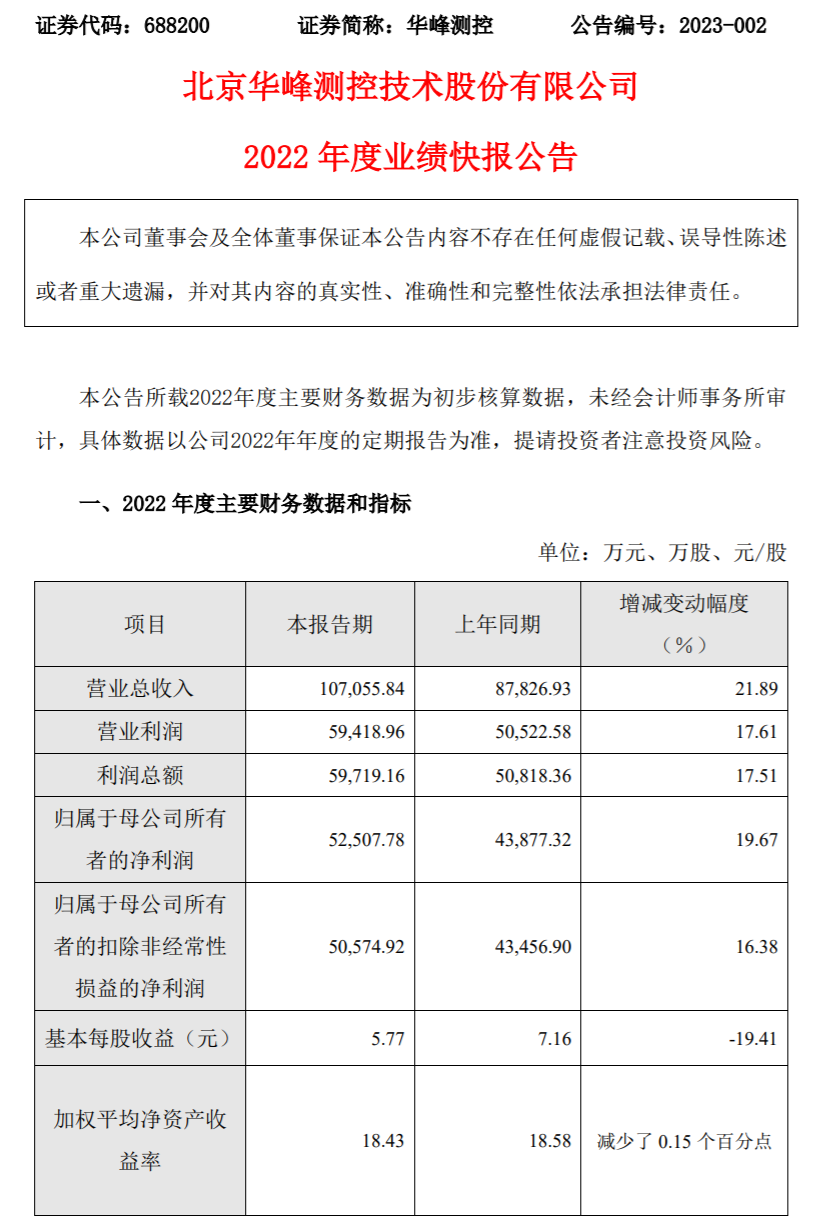 公告显示,华峰测控总资产337,029.83万元,比本报告期初增长15.63%;基本每股收益5.77元,上年同期7.16元。