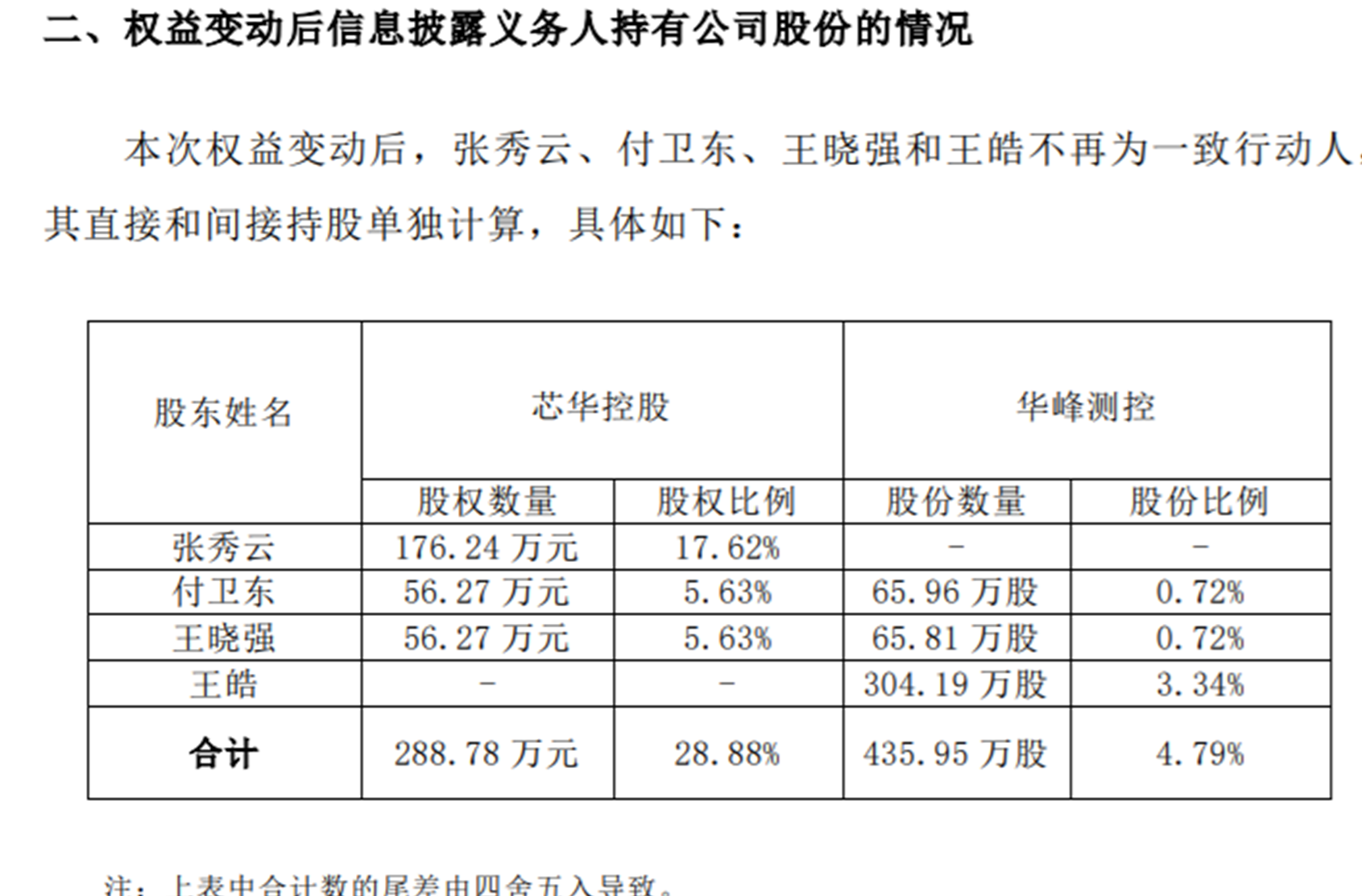 本次权益变动前,张秀云等八人合计持有芯华控股59.26%的股份,直接持有华峰测控4.83%的股份。直接、间接合计持有上市公司股份比例约为22.38%。