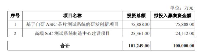 此次华峰测控发行可转债拟募资 10 亿元,扣除发行费用后将用于两个项目:一是基于自研 ASIC 芯片测试系统的研发创新项目,投资总额 7.59 亿元,拟投入募集资金 7.59 亿元;二是高端 SoC 测试系统制造中心建设项目,投资总额 2.54 亿元,拟投入募集资金 2.41 亿元。
