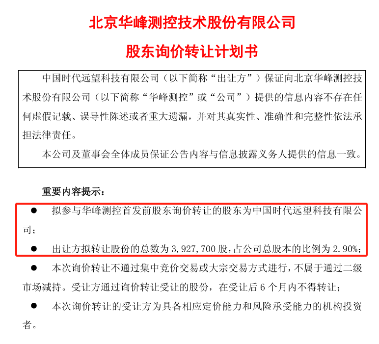 华峰测控的第三大股东中国时代远望科技有限公司宣布,拟通过询价转让方式减持392.77万股,占总股本的2.9%,转让底价为公告日前20个交易日股票均价的70%。