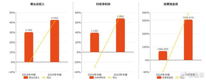 公司营业总收入为5.34亿元,较去年同报告期营业总收入增加1.55亿元,同比较去年同期上涨40.99%。归母净利润为1.96亿元,在已披露的同业公司中排名第36,较去年同报告期归母净利润增加8329.30万元,同比较去年同期上涨74.04%。经营活动现金净流入为7070.97万元,在已披露的同业公司中排名第75,较去年同报告期经营活动现金净流入增加5502.77万元,同比较去年同期上涨350.90%。