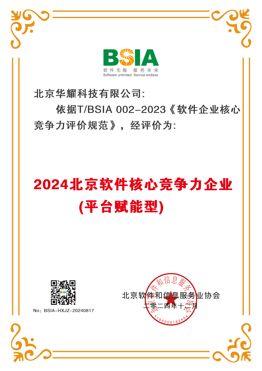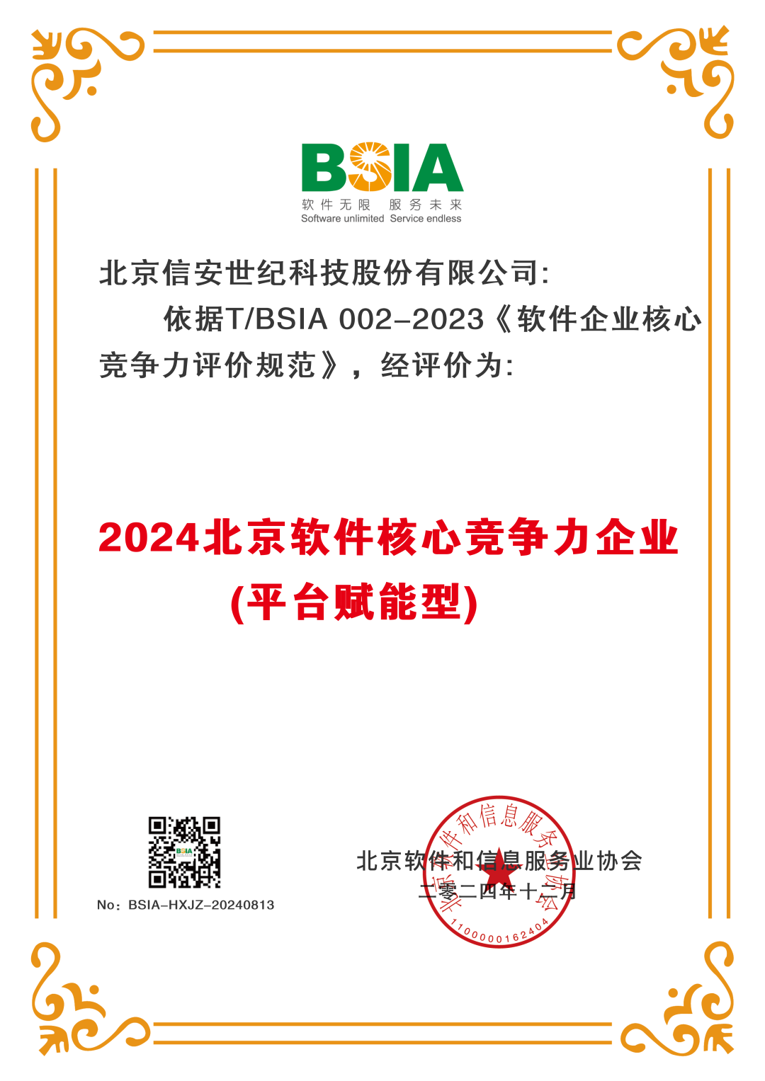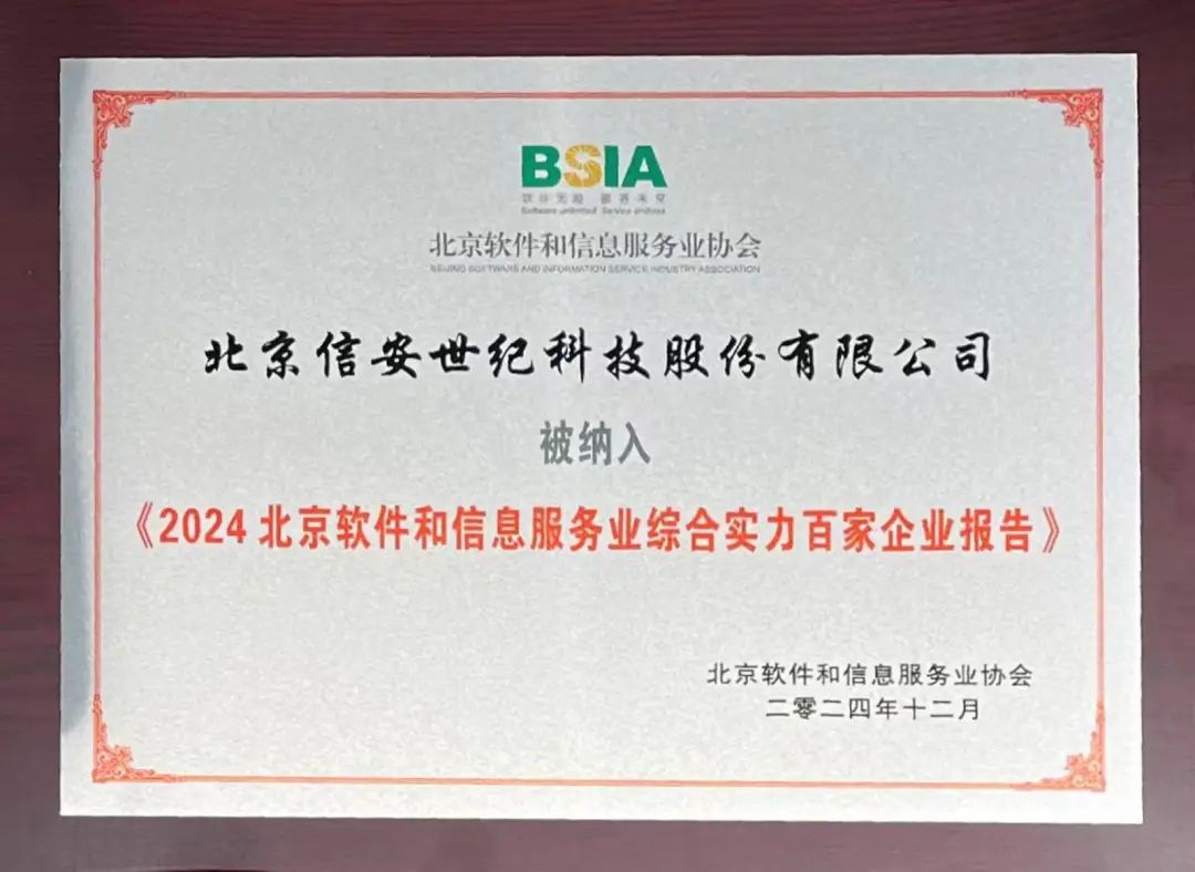 12月26日,北京软件和信息服务业协会第十一届会员代表大会第二次会议暨第十一届理事会第二次会议在北京召开。会上发布了《2024北京软件和信息服务企业综合实力报告》和《2024北京软件企业核心竞争力评价报告》,信安世纪凭借出色的整体实力,入选“2024北京软件和信息技术服务业综合实力前百家企业”,同时,信安世纪及子公司华耀科技获评“2024北京软件企业核心竞争力评价(平台赋能型)企业”。
