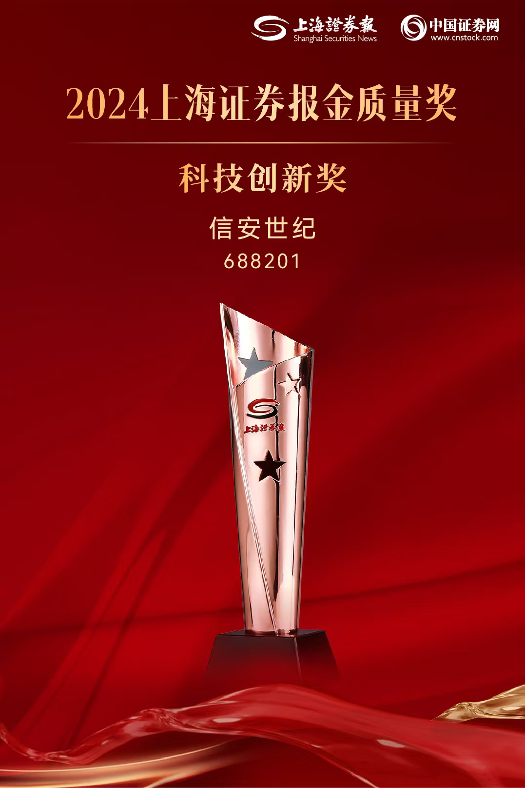 2024年12月26日至27日,由新华社上海证券报等单位联合主办的上证·滴水湖上市公司高质量发展大会暨“上证·金质量”颁奖仪式在上海临港中心举办,北京信安世纪科技股份有限公司(以下简称“信安世纪”,股票代码:688201)凭借持续高占比科研投入、研发机制建设、自主创新构筑等方面的优秀表现,荣膺“科技创新奖”。