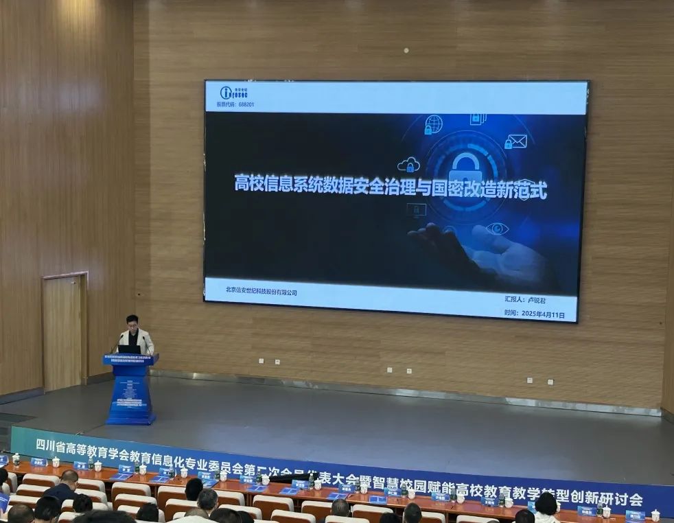 4月11日,四川省高等教育学会教育信息化专业委员会第二次会员代表大会暨智慧校园赋能高校教育教学转型创新研讨会在四川内江圆满召开。北京信安世纪科技股份有限公司(以下简称“信安世纪”)受邀参会并发表《高校信息系统数据安全治理与国密改造新范式》主题演讲,为新时代教育数字化转型提供密码安全解决方案。