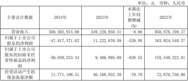 2024年,公司实现营业收入5.01亿元,同比减少8.86%;归属于上市公司股东的净利润-4781.76万元,同比减少526.08%;归属于上市公司股东的扣除非经常性损益的净利润-5003.82万元,同比减少628.55%;经营活动产生的现金流量净额1177.11万元,同比减少70.70%。