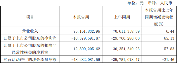2025年第一季度,公司实现营业收入7516.18万元,同比增长6.44%;归属于上市公司股东的净利润-1037.96万元,上年同期为-2976.63万元;归属于上市公司股东的扣除非经常性损益的净利润-1280.02万元,上年同期为-3035.43万元;经营活动产生的现金流量净额-4828.21万元,上年同期为-3975.11万元。
