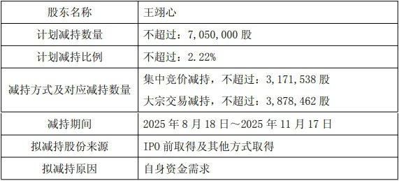 因股东自身资金需求,公司控股股东、实际控制人之一、董事、高级管理人员、核心技术人员王翊心计划拟自公告披露日起15个交易日后的3个月内,通过集中竞价方式、大宗交易方式合计减持股份数量不超过7,050,000股,减持股份比例不超过公司总股本的2.22%。其中拟通过集中竞价交易方式减持股份数量不超过3,171,538股,减持比例不超过公司总股本的1%,且在任意连续90个自然日内减持的股份总数不超过公司股份总数的1%;拟通过大宗交易方式减持股份数量不超过3,878,462股,减持比例不超过公司总股本的1.22%,且在任意连续90个自然日内减持的股份总数不超过公司股份总数的2%。