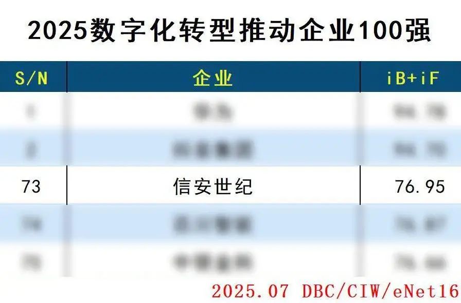 近日,由中国科学院主管、中国科技出版传媒股份有限公司主办的商业期刊《互联网周刊》(CIW)联合德本咨询(DBC)、eNet16发布了《2025数字化转型推动企业100强》,北京信安世纪科技股份有限公司(股票代码:688201)凭借在数字安全领域的创新实践与行业赋能成果,成功入选该榜单。未来,公司将持续深化信息安全技术创新,拓展行业应用,为数字化转型不断注入安全动能。