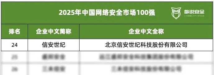 近日,数说安全正式发布《2025年中国网络安全市场100强》榜单,北京信安世纪科技股份有限公司(以下简称“信安世纪”,股票代码:688201)凭借卓越的资源支撑力与市场表现力,从数百家参评企业中脱颖而出,再度荣登百强榜单,位列第24位。此前,信安世纪已成功入围数说安全发布的《2025年中国网络安全市场全景图》,在多个细分领域获得认可,持续领跑行业赛道。