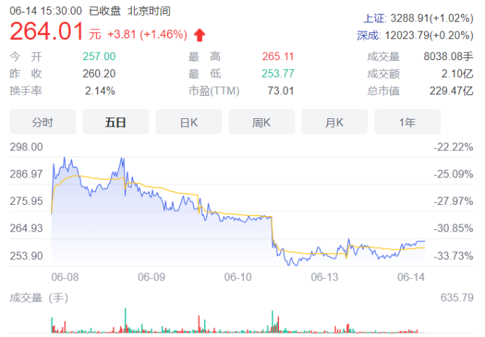 截至6月14日收盘,美迪西股价报收264.01元/股,微涨1.46%,最新市值为229.47亿元。