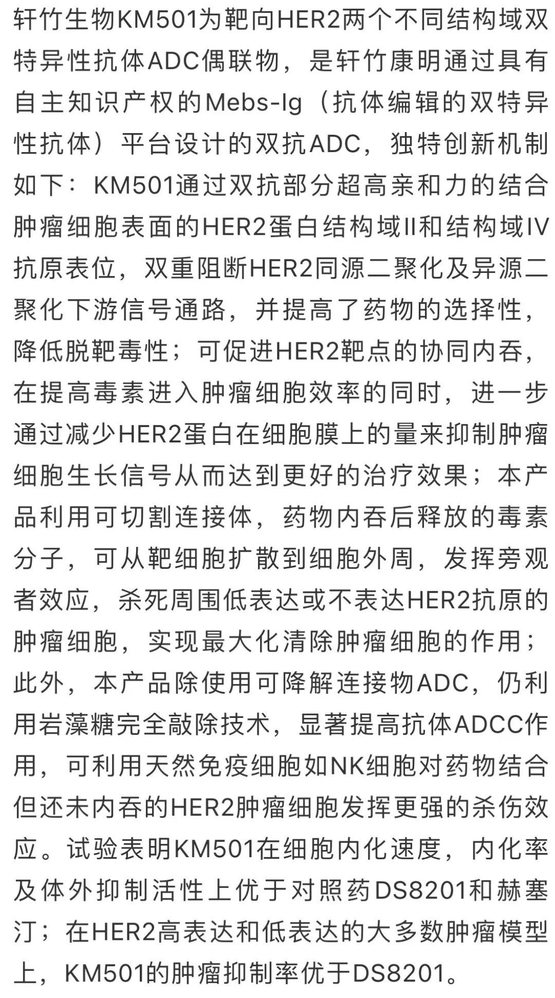 近日,轩竹生物科技股份有限公司(以下简称“轩竹生物”)及其旗下全资子公司北京轩竹康明生物科技有限公司双抗ADC药物KM501获得临床试验批件(编号:2023LP00278)。本品适用于治疗HER2阳性/表达、扩增或突变的局部晚期/转移性实体瘤,包括HER2低表达的相关晚期肿瘤。