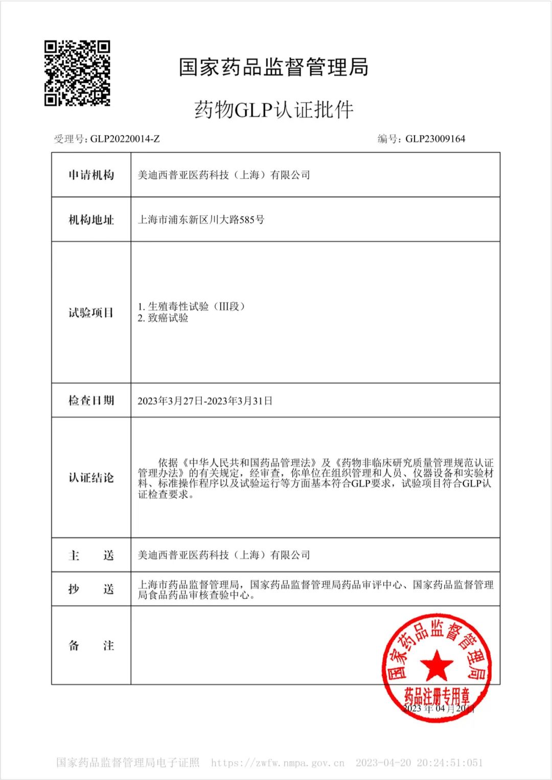 4月20日,上海美迪西生物医药股份有限公司(以下简称“美迪西”)全资子公司美迪西普亚医药科技(上海)有限公司(以下简称“美迪西普亚”)新增实验设施(南汇园区)获得国家药品监督管理局(NMPA)药物GLP(Good Laboratory Practice)认证资质,并新增生殖毒性试验(Ⅲ段)、致癌试验资质两项GLP认证批件,同时顺利通过NMPA药物GLP三年定期复查。