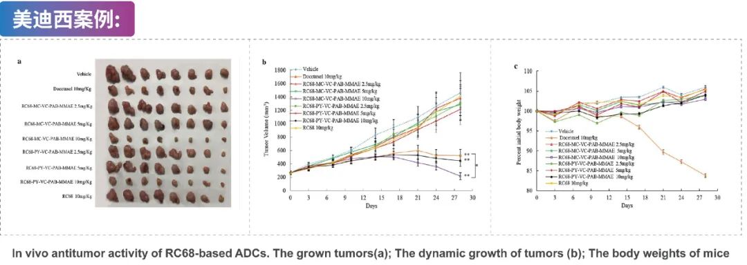通过MC-VC-PAB或PY-VC-PAB连接子使纯化的人源化抗EGFR单克隆抗体(RC68)与MMAE偶联生成RC68-MC-VC-PAB-MMAE和RC68-PY-VC-PAB-MMAE。RC68-MC-VC-PAB-MMAE和RC68-PY-VC-PAB-MMAE的体内抗肿瘤活性检测通过美迪西进行。BALB/c裸鼠皮下移植H125细胞,当肿瘤长到 100-300 mm3 时,将小鼠随机分组并每周用指定药物进行静脉给药。通过测量肿瘤体积和小鼠体重从而衡量每种药物对的影响。10 mg RC68-MC-VC-PAB-MMAE或RC68-PY-VC-PAB-MMAE 给药处理后显著抑制小鼠H125肿瘤的生长,且不影响小鼠体重。