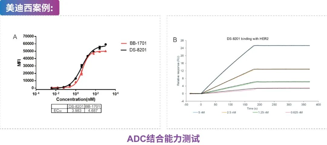 ?SPR分析ADC与抗原蛋白的结合能力(图B:DS-8201与HER2蛋白结合测试)。