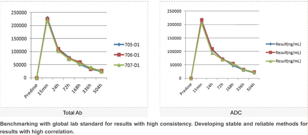 由于ADC药物组成成分复杂,其PK特性必须借助多个分析物的评估,因此增加了分析的难度。美迪西在ADC药物的体内分析中为各种ADC组分分析物提供了多种高质量的测试方法,通过分析动物体内采集的血浆/血清样本,为客户提供可靠优质的PK数据。