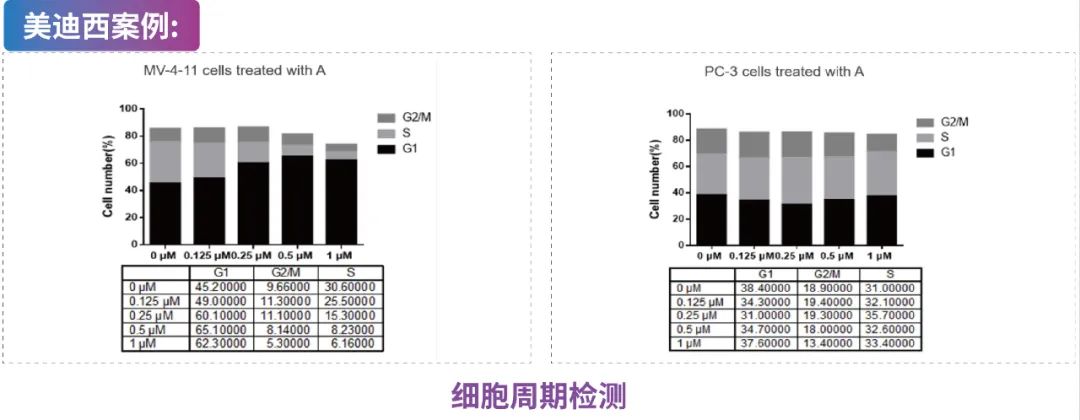 MV-4-11细胞(人髓性单核细胞白血病细胞)和PC-3细胞(人前列腺癌细胞)用Compound A处理并用PI染色,进行基于FACS的细胞周期分析。数据显示Compound A显著阻断MV-4-11细胞周期,对PC-3细胞没有太大影响。说明Compound A具有适应症特异性。