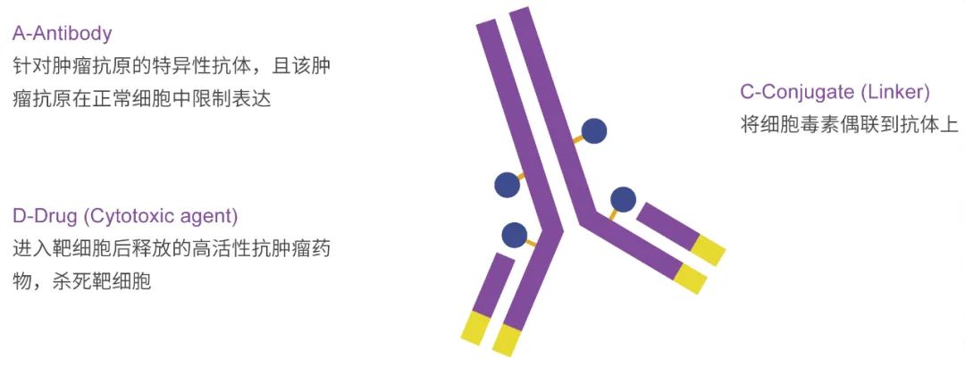 ADC 的三个主要组成部分是抗体(Antibody)、连接子(Linker)和有效载荷(Payload)。