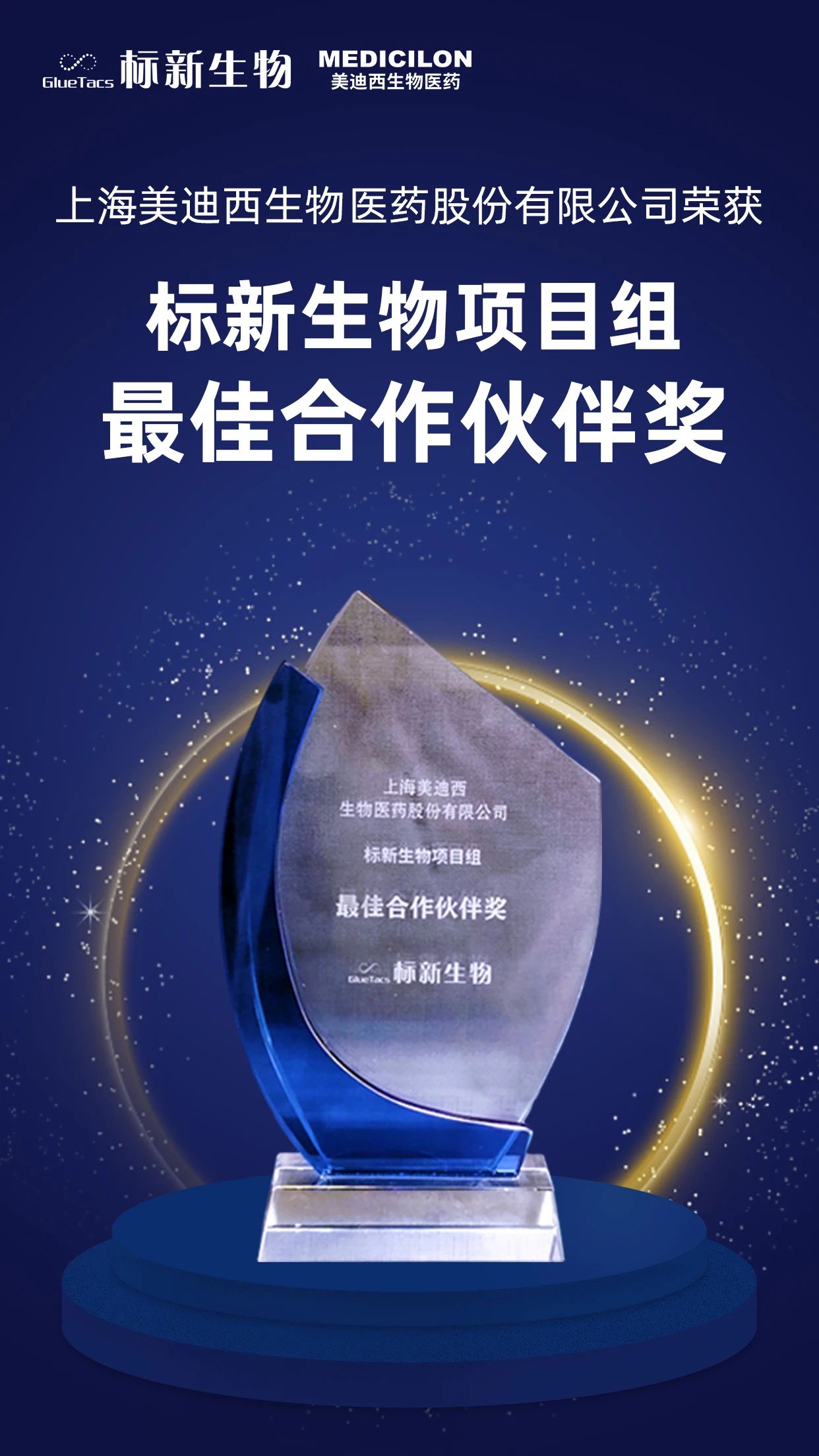 1月8日,标新生物医药科技(上海)有限公司(以下简称“标新生物”)董事长兼CEO杨小宝博士授予上海美迪西生物医药股份有限公司(以下简称“美迪西”)“2023年度最佳合作伙伴奖”。美迪西首席商务官蔡金娜博士、CMC业务总监张柏林出席了此次颁奖仪式。