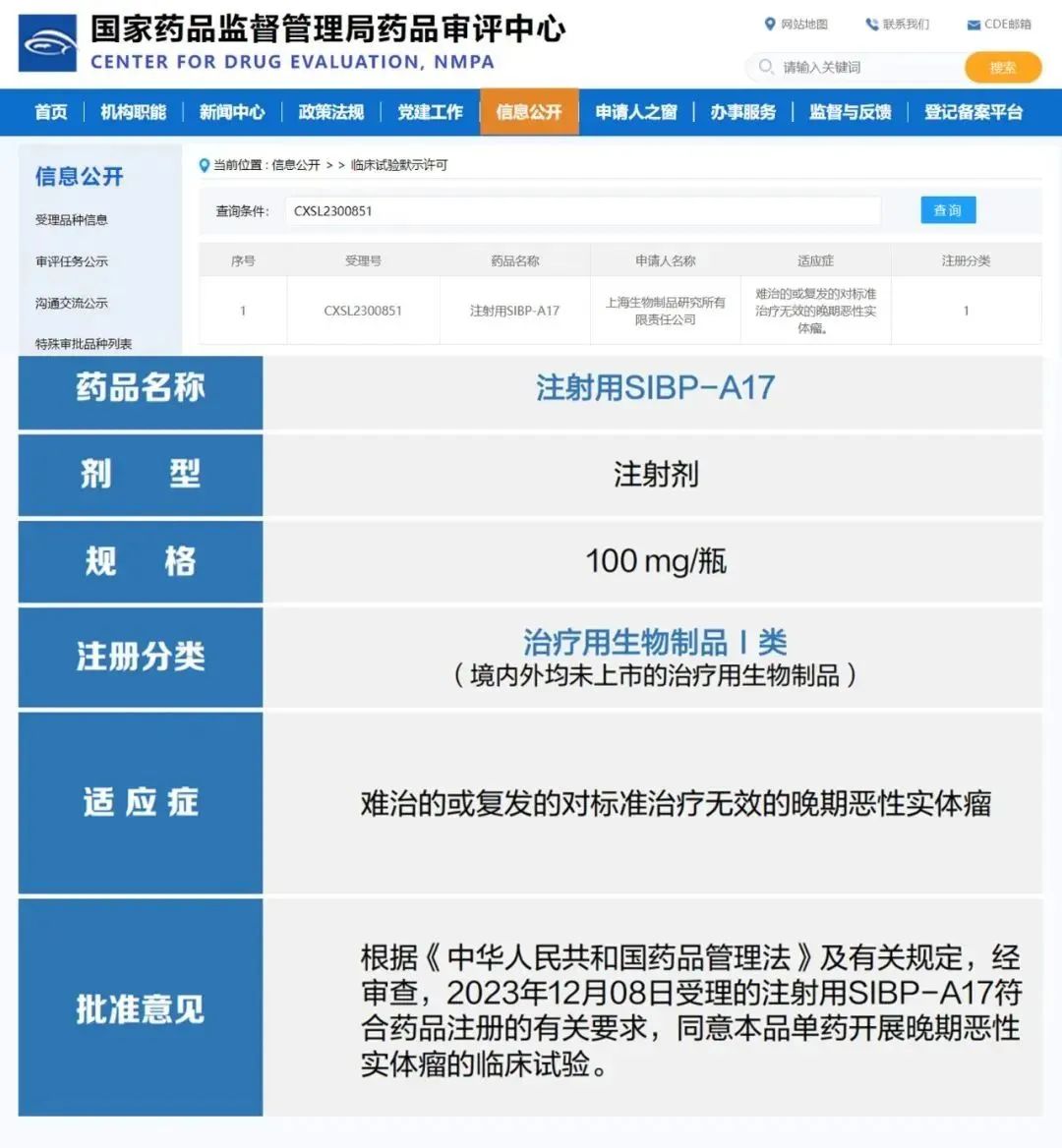 2月19日,国药集团中国生物上海生物制品研究所(以下简称“上海生物制品研究所”)自主研发的第二款I类创新型抗体偶联药物(ADC)SIBP-A17获得国家药品监督管理局临床试验批准通知书。该产品拟用于在晚期恶性实体瘤患者中开展临床试验。
