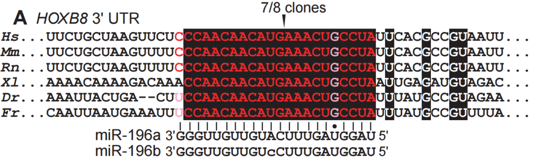 miR-196 与 HOXB8 结合位点示意图[5]