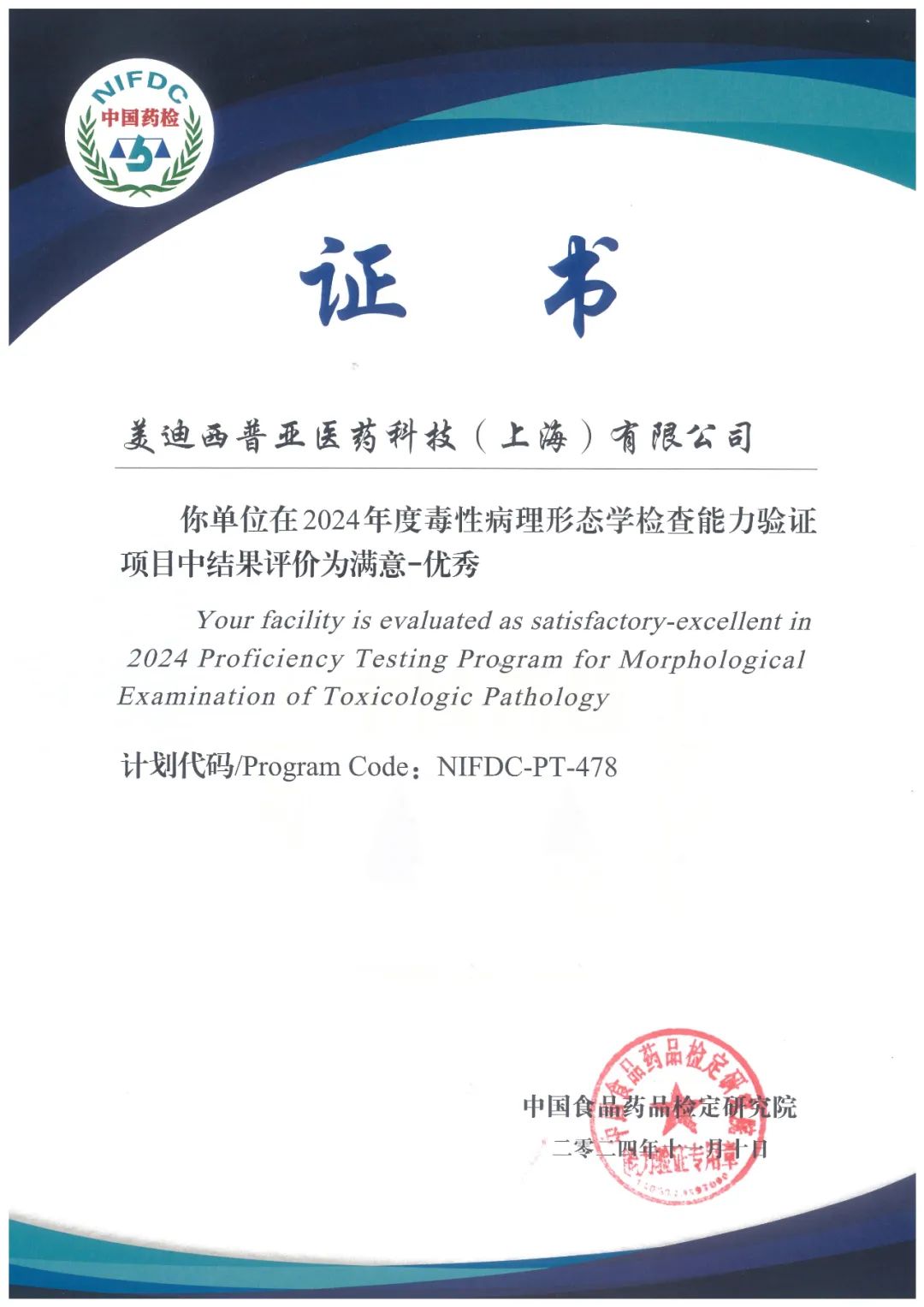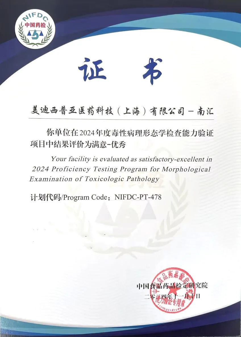 近期,上海美迪西生物医药股份有限公司(以下简称“美迪西”)全资子公司美迪西普亚医药科技(上海)有限公司(以下简称“美迪西普亚”)和南汇园区在中国食品药品检定研究院组织的2024年度毒性病理形态学检查能力验证项目(NIFDC-PT-478)中,均获得“优秀”评价。这不仅是对美迪西在病理学研究领域专业实力的权威认可,也是对持续创新和质量管控的肯定。