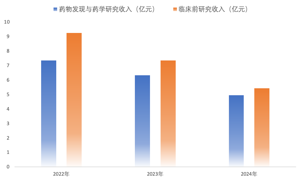 毛利率下滑趋势更为严峻,2024年,药物发现与药学研究业务毛利率已由正转负,录得-3.68%;临床前研究业务毛利率则降至15.37%,与2021年同期的48.77%相比,大幅缩水33.4个百分点。