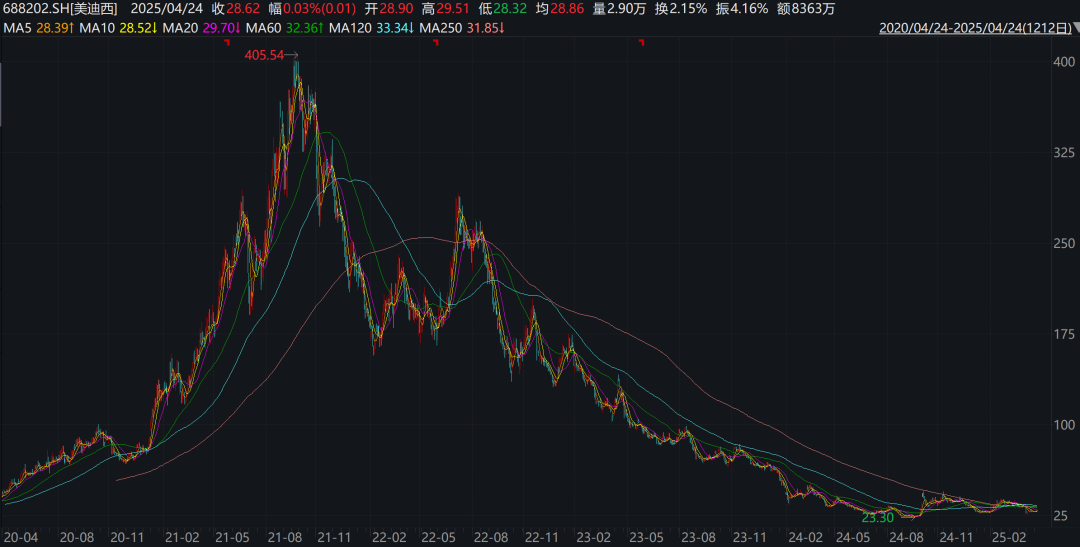 回溯美迪西股价走势,早在2021年9月触及407.19元/股(按前复权计算,下同)高点后,该公司股价便开启持续下行通道,相继跌破300元/股、200元/股、100元/股和50元/股等重要整数关口。进入2025年,这一跌势还在继续,截至4月24日收盘,该股报收于28.62元/股,相较于此前407.19元/股高位,跌超九成,市场表现低迷。