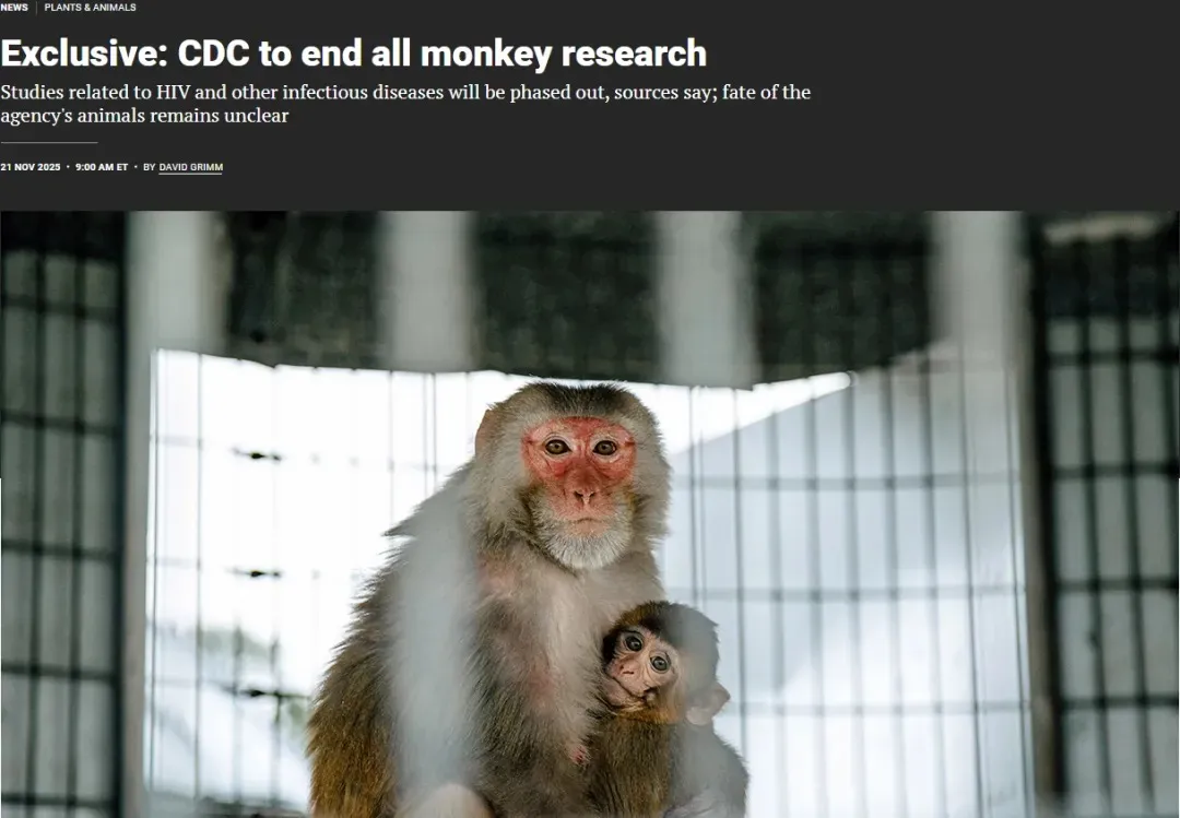 11月21日,全据《Science》杂志:美国疾病控制与预防中心(CDC)宣布年底前终止所有涉及灵长类动物的研究项目,约200只参与 艾滋病 、肝炎等重大传染病研究的恒河猴与食蟹猴正式退出实验。