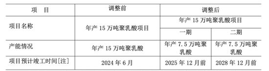 2024年3月,公司主动放缓了该项目的投资建设进度,将ipo募投的“年产15 万吨聚乳酸项目”,调整为两期实施。