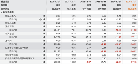 2025年1季度,公司延续收入增长但盈利下滑的业绩,扣非净利润同比下降97%,处于不赚钱的盈亏平衡点。