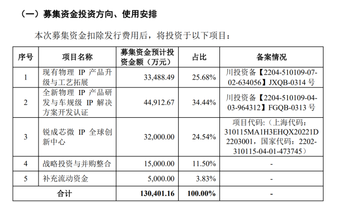 当时,锐成芯微的募投项目包括现有物理IP产品升级与工艺拓展,全新物理IP产品研发与车规级IP解决方案开发认证,锐成芯微IP全球创新中心,战略投资与并购整合和补充流动资金。