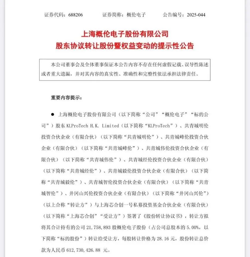 根据公告,概伦电子股东KLProTech H.K. Limited(境外持股平台)、共青城明伦投资等7家员工持股平台,与上海芯合创签署《股份转让协议书》,拟转让合计2175.89万股(占总股本5%),每股转让价28.16元,较公告当日收盘价溢价约8%。