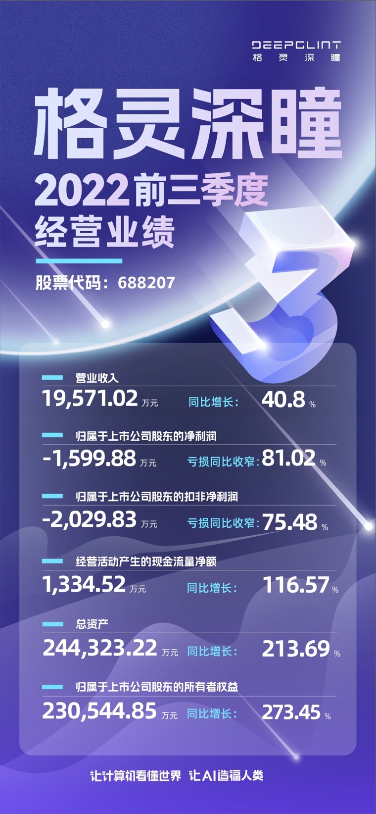 格灵深瞳于2022年10月28日披露三季报,公司2022年前三季度实现营业总收入1.96亿元,同比增长40.8%;实现归母净利润-1600万元,上年同期为-8429.7万元,亏损幅度收窄。