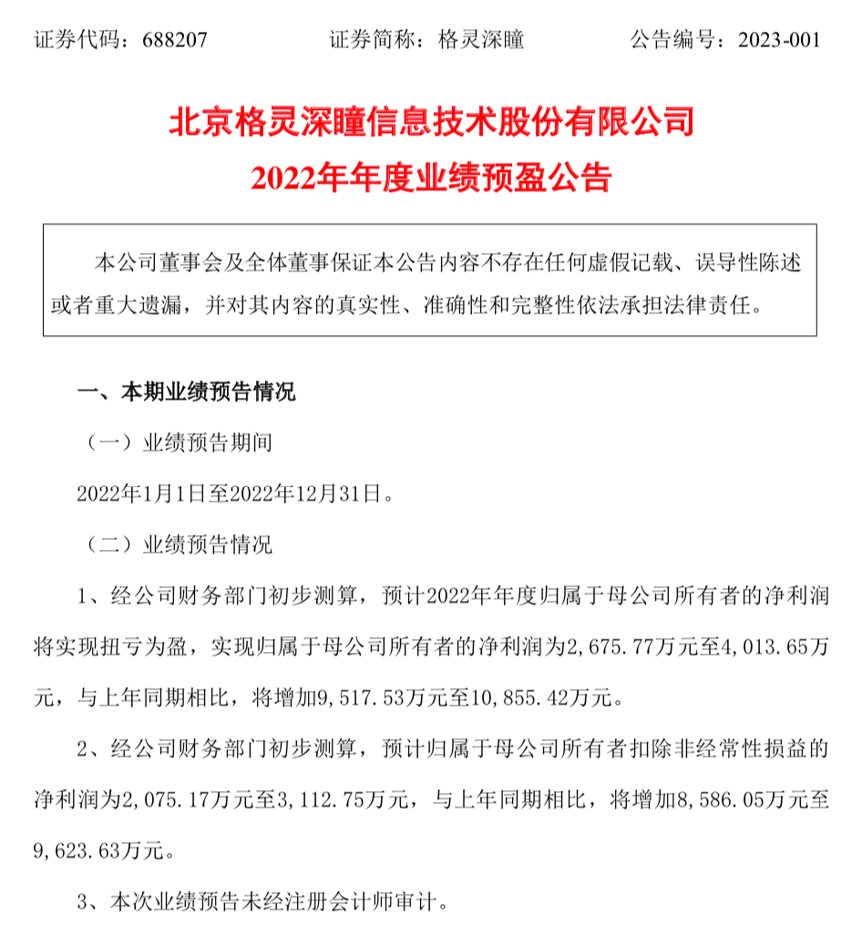 据1月30日上交所官网发布的格灵深瞳2022年度业绩预盈公告显示,格灵深瞳2022年预计实现归属于母公司所有者的净利润为2,675.77万元至4,013.65万元,与上年同期相比,将增加9,517.53万元至10,855.42万元。