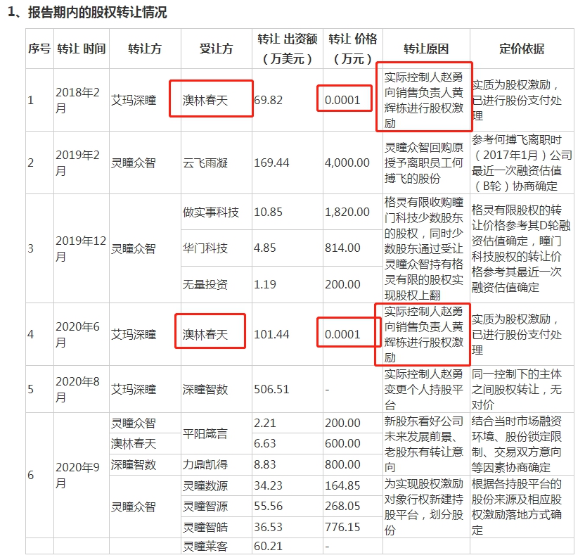 据格灵深瞳2022年发布的招股书,澳林春天为格灵深瞳销售负责人黄辉栋的持股平台。澳林春天出资比例分别为黄辉栋99.99%、黄敬淳0.01%,而黄敬淳为黄辉栋之子。黄辉栋这部分股权的来源主要是实际控制人赵勇对其进行股权激励,其中在2018年2月及2020年6月,赵勇分别以1元的价格向黄辉栋转让出资额69.82万美元及101.44万美元。