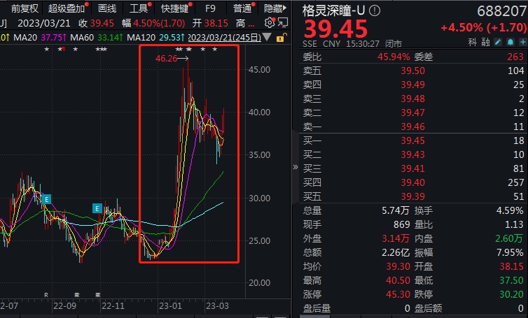 二级市场上,在ChatGPT概念火热期间,格灵深瞳股价也趁势大涨,从1月份不足25元/股一度涨至46元/股。截至21日收盘,该股涨4.5%,报39.45元/股,公司总市值73亿元。(中新经纬APP)