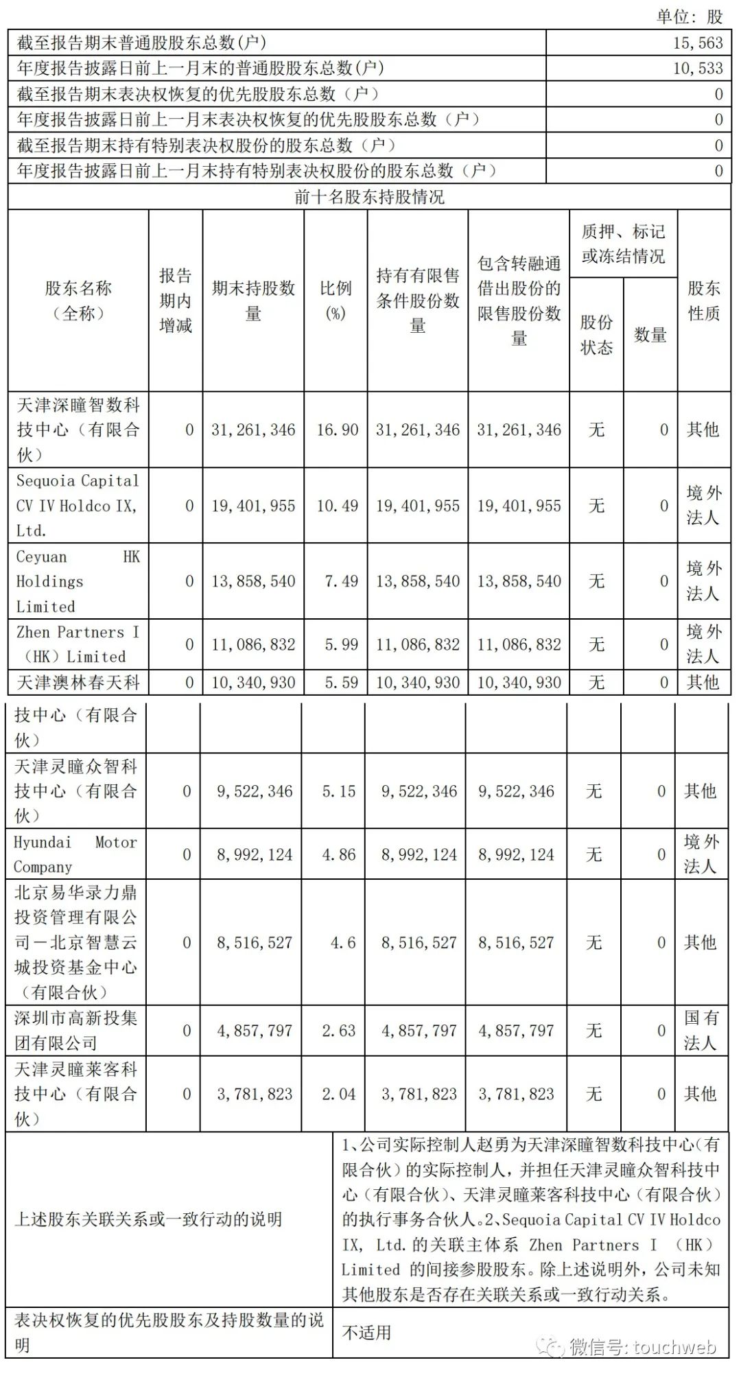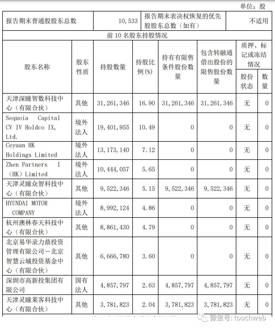 Zhen Partners I(真格基金)持股为5.99%,天津澳林春天科技中心(有限合伙)持股为5.59%,天津灵瞳众智科技中心(有限合伙)持股为5.15%,Hyundai Motor Company(现代汽车)持股4.86%;
