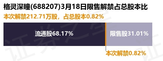 根据市场公开信息整理,格灵深瞳(688207)于3月18日将有212.71万股限售股份解禁上市,为公司首发战略配售股份,占公司总股本0.82%。最近一年内,该股累计解禁155.38万股,占总股本的0.6%。本次解禁后,公司还有8031.04万股限售股份,占总股本31.01%。具体如下图所示: