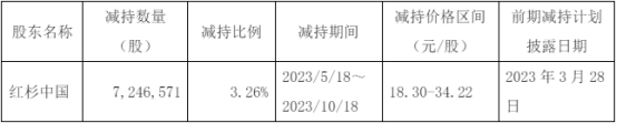 过去12个月内,红杉中国于2023年5月18日至2023年10月18日减持公司股份7,246,571股,减持比例为3.26%,减持价格区间为18.30元/股至34.22元/股。