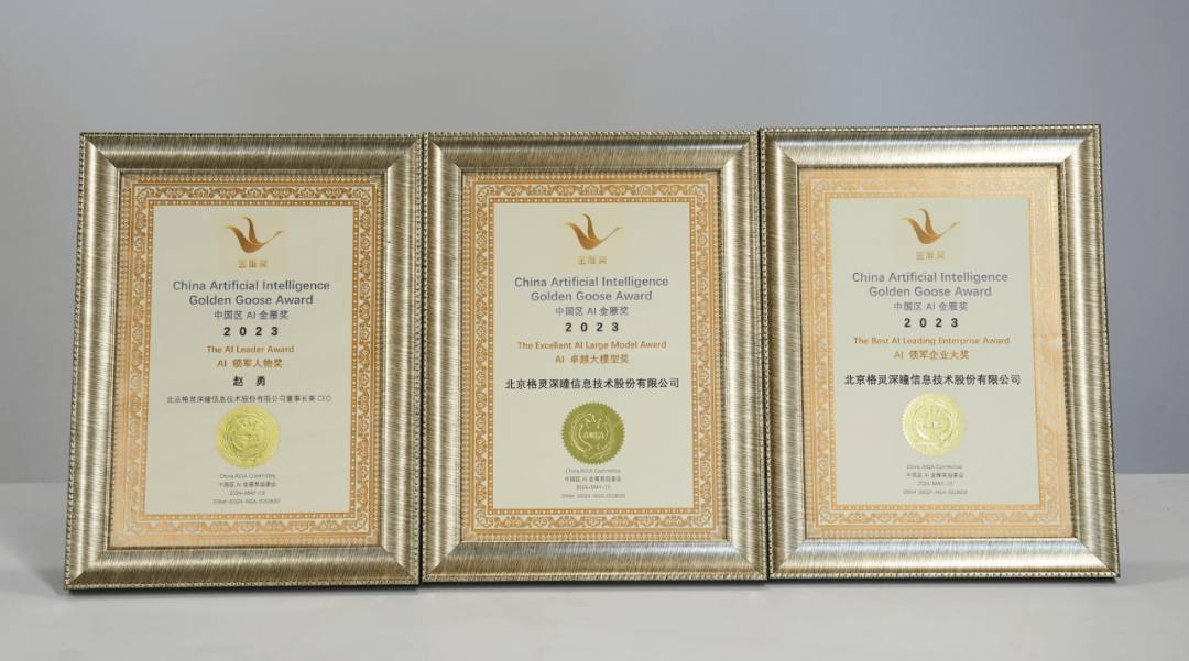 近日,由北京市经济和信息化局、中国电子商会人工智能专委会、中国电子信息行业联合会等主办的2024全球数字经济大会分会暨第四届 China AIGA中国区 AI金雁奖颁奖典礼在北京隆重召开。格灵深瞳凭借领先的技术实力、扎实的产品能力以及广泛的落地场景,荣获“2023 AI 领军企业大奖”和“AI卓越大模型奖”。同时,格灵深瞳创始人、董事长、CEO赵勇荣获“2023 AI领军人物奖”。