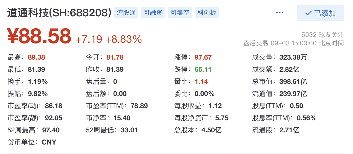 9月3日,截至收盘,道通科技(SH:688208)涨8.83%,现报88.58元。成交额为2.82亿元,总市值为398.61亿元。