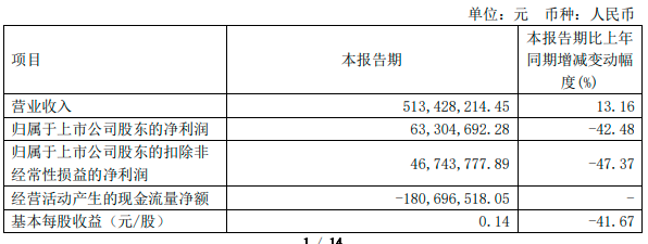 公告显示,2022年第一季度公司营业收入5.13亿元,同比增长13.16%;归属于上市公司股东的净利润6330.47万元,同比减少42.48%;归属于上市公司股东的扣除非经常性损益的净利润4674.38万元,同比减少47.37%;基本每股收益0.14元,同比减少41.67%。