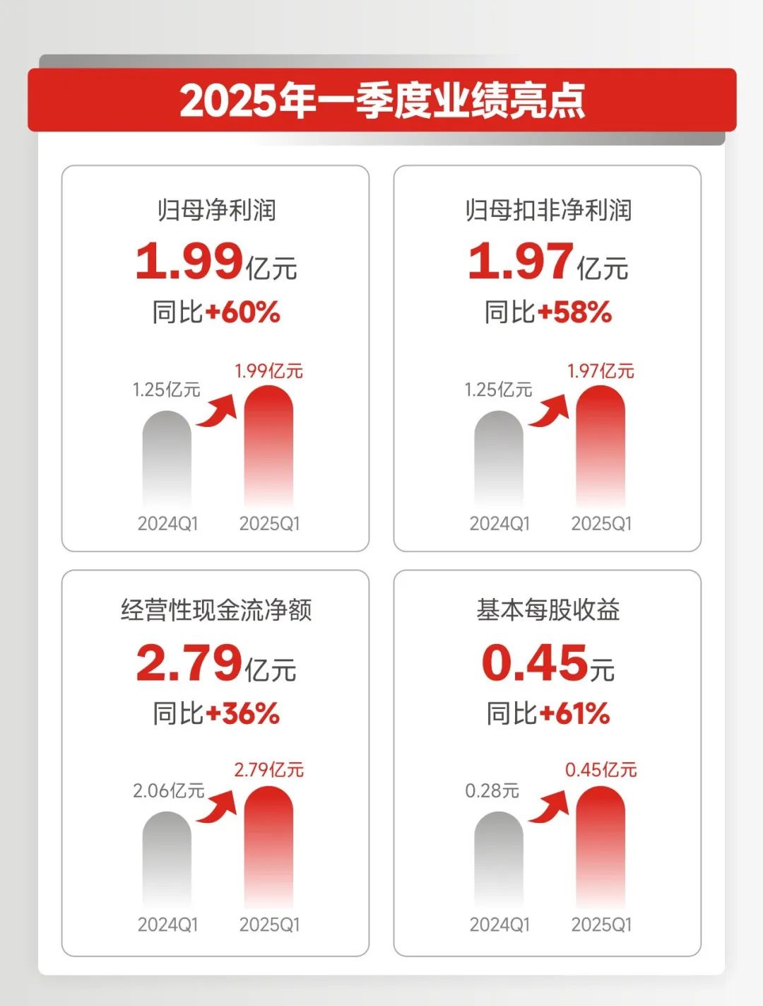 4月25日晚,道通科技(688208)发布2025年第一季度报告,交出一份营收净利双增的“高质量成绩单”。报告显示,公司一季度实现营业收入10.94亿元,同比增长26.71%;归母净利润1.99亿元,同比大幅增长59.91%;经营性现金流净额达2.79亿元,同比增长35.75%,盈利能力与现金流质量同步提升。
