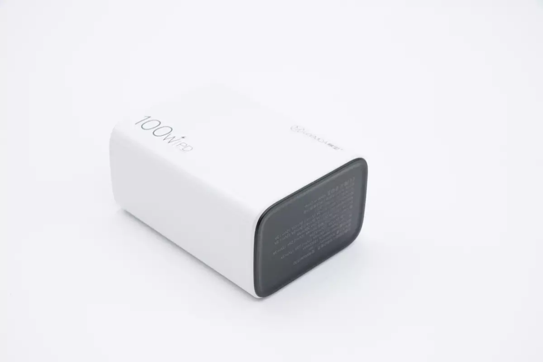 慕里PD 100W充电宝整体为简约风格设计的光滑亮面白色聚碳酸酯外壳,搭配内部细纹磨砂工艺,侧看拥有彩虹渐变的视觉体验;与侧面的深邃黑细纹磨砂配色盖板拼接而成,侧面弧形过渡,线条分明,侧面平整,皆可立于桌面。