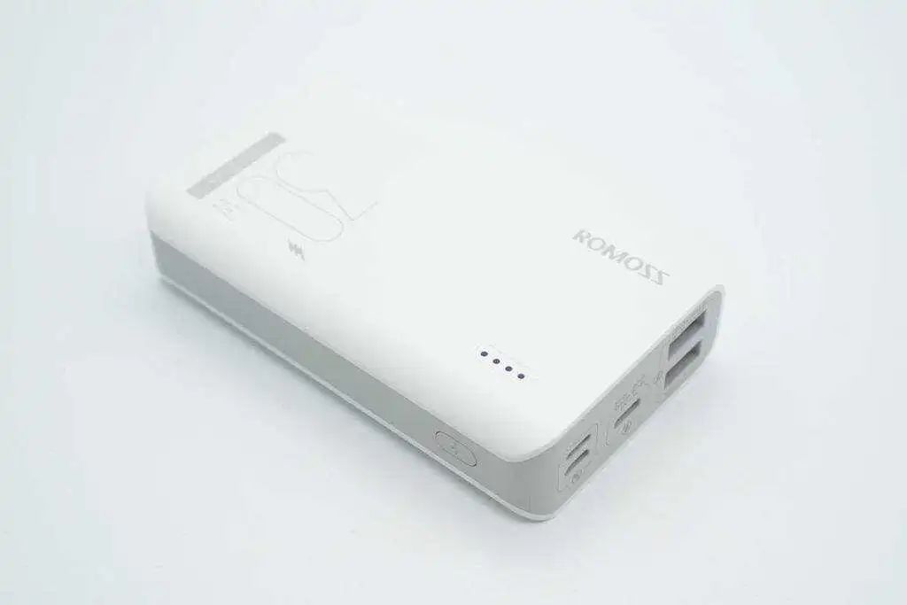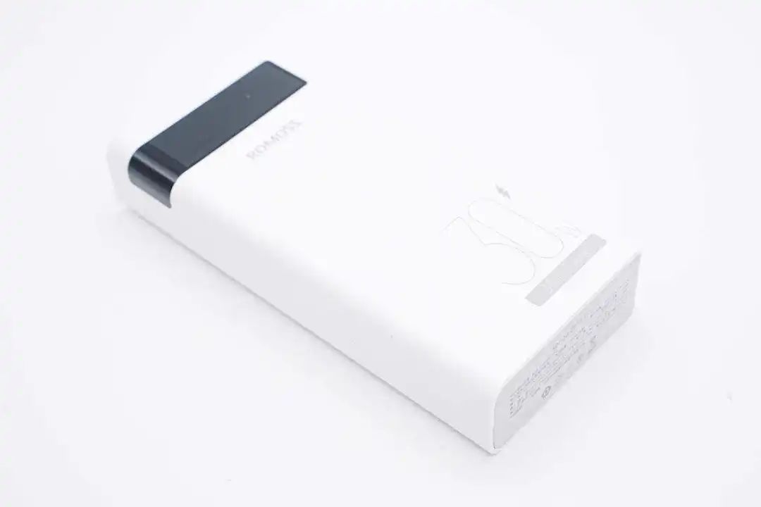 罗马仕这款30W移动电源采用家族式的外观设计,辨识度很高,采用PC材质塑料外壳,灰+白配色,表面磨砂抗指纹