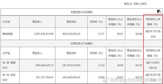 2023年,英集芯的主营业务集成电路的毛利率减少了9.19个百分点,其中电源管理芯片的毛利率减少10.88个百分点,快充协议芯片的毛利率减少4.59个百分点。