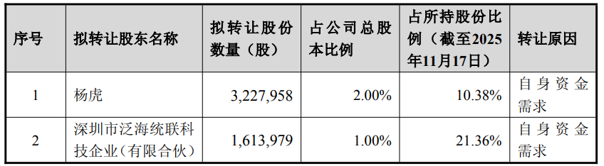 公司控股股东、实际控制人杨虎及其一致行动人深圳市泛海统联科技企业(有限合伙)(简称“出让方”),拟转让股份的总数为4,841,937股,占公司总股本的比例为3.00%。