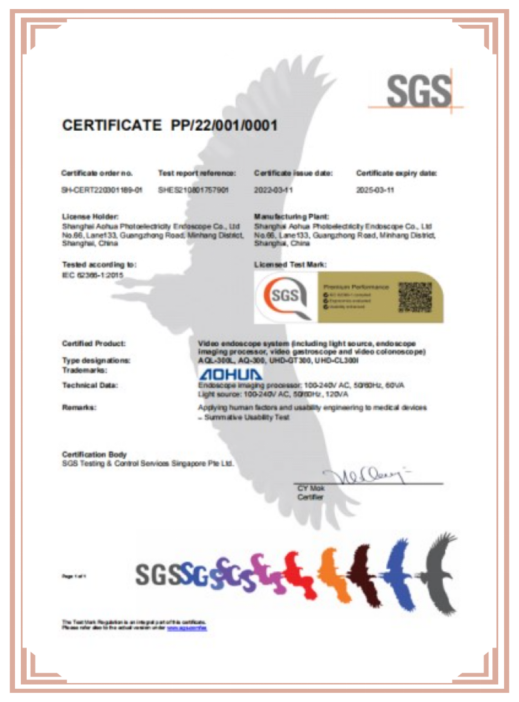 本次测试的结论及报告、产品及整个流程经过SGS全球发证官及技术专家的综合评估,得到高度认可并授予卓越性能标志及证书。本次卓越性能标志及证书的获得,体现了澳华内镜系统的研发设计于可用性方面的卓越性能:严格遵循IEC 62366-1标准要求(IEC 62366-1 complied)、符合人体工程学评估(Ergonomics evaluated)及充分改善可用性(Usability enhanced)。
