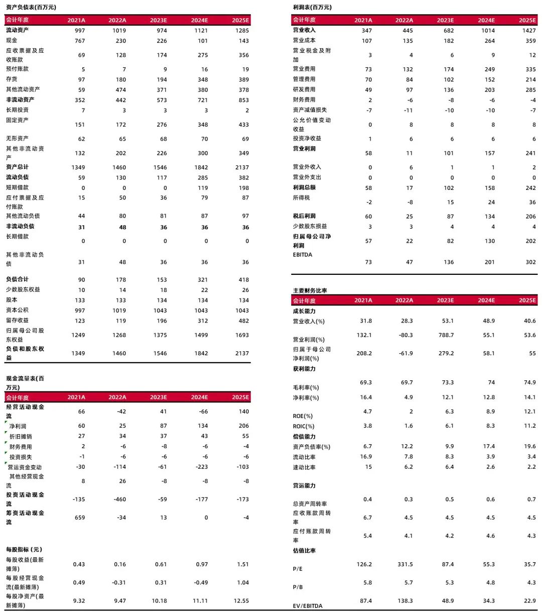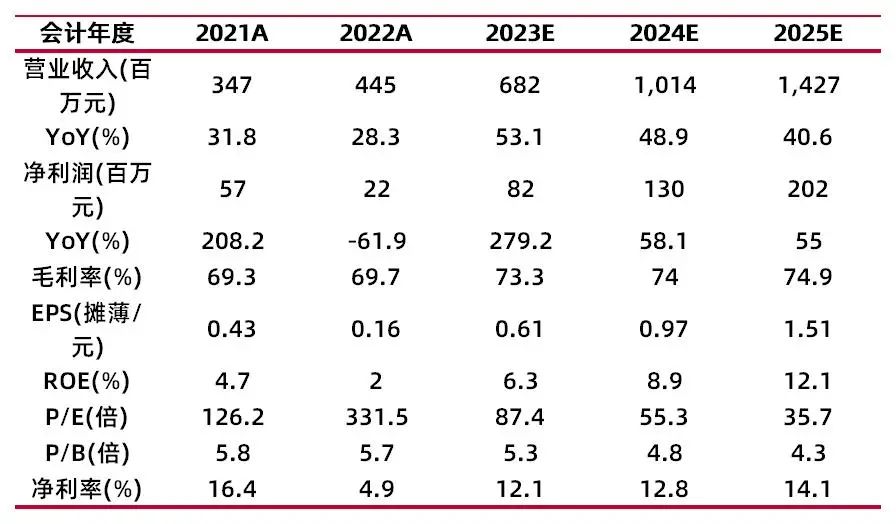 预计公司2023-2025年分别实现营收6.82、10.14、14.27亿元,同比增长53.1%、48.9%、40.6%;分别实现净利润0.82、1.30、2.02亿元,同比增长279.2%、58.1%、55.0%;对应EPS分别为0.61、0.97、1.51元,以8月15日收盘价53.74元计算,对应PE分别为87.4X、55.3X、35.7X,维持“增持-B”评级。